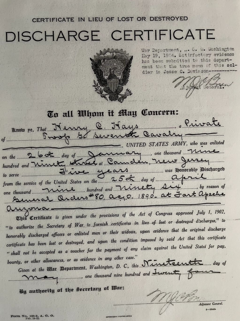 To collect a pension Jesse had to prove his true identity to the War Department.