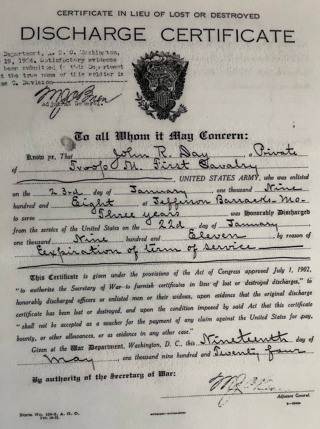 Third alias name was Jack R. Day (Mule Skinner) civilian working for the Army Signal Corps